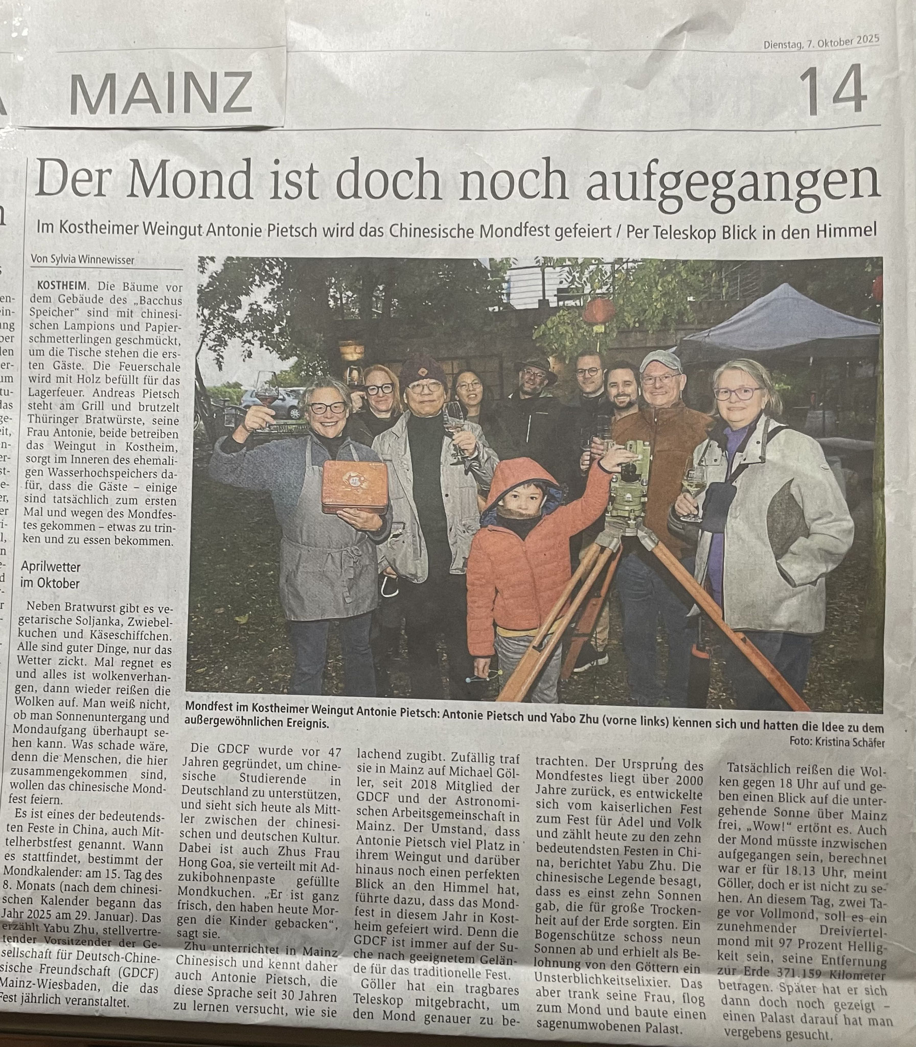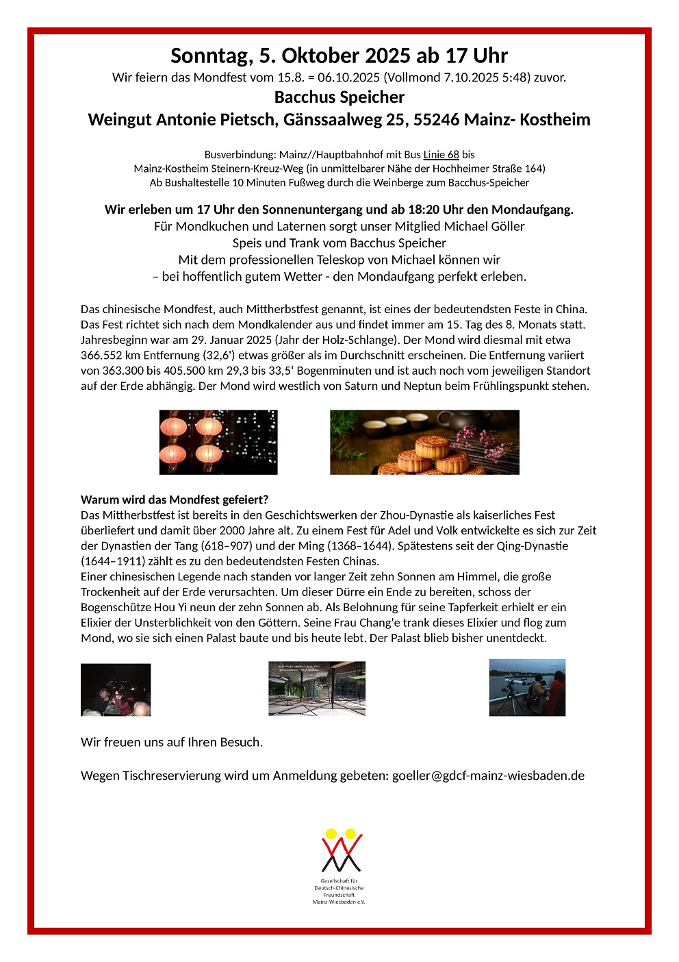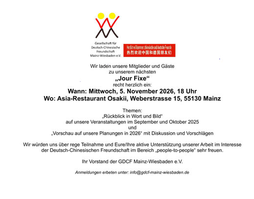 Die GDCF Mainz-Wiesbaden hat das Ziel, die deutsch-chinesischen Beziehungen auszubauen und das gegenseitige Verständnis zwischen beiden Völkern zu fördern.