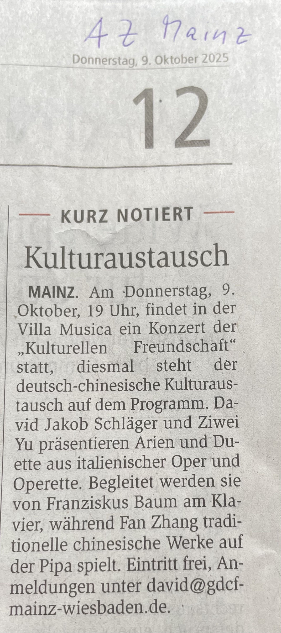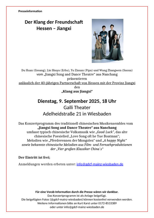 Auf der Mitgliederversammlung der Gesellschaft für Deutsch-Chinesische Freundschaft Mainz-Wiesbaden sind die Vorstandsmitglieder in ihren Ämtern bestätigt worden. Dem Vorstand gehören noch zwei Jahre lang an: Kurt Karst als Vorsitzender, Prof. Anne Shih und Yabo Zhu als stellvertretende Vorsitzende, Robert Pfeifruk als Schatzmeister sowie Lei Wang und Udo Lühring als Beisitzer.